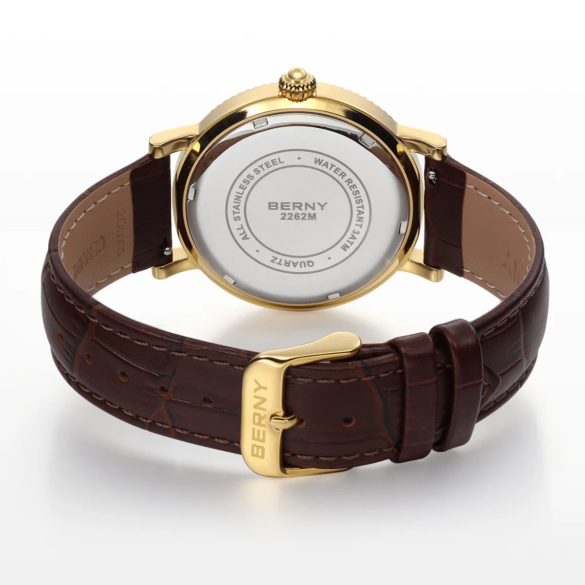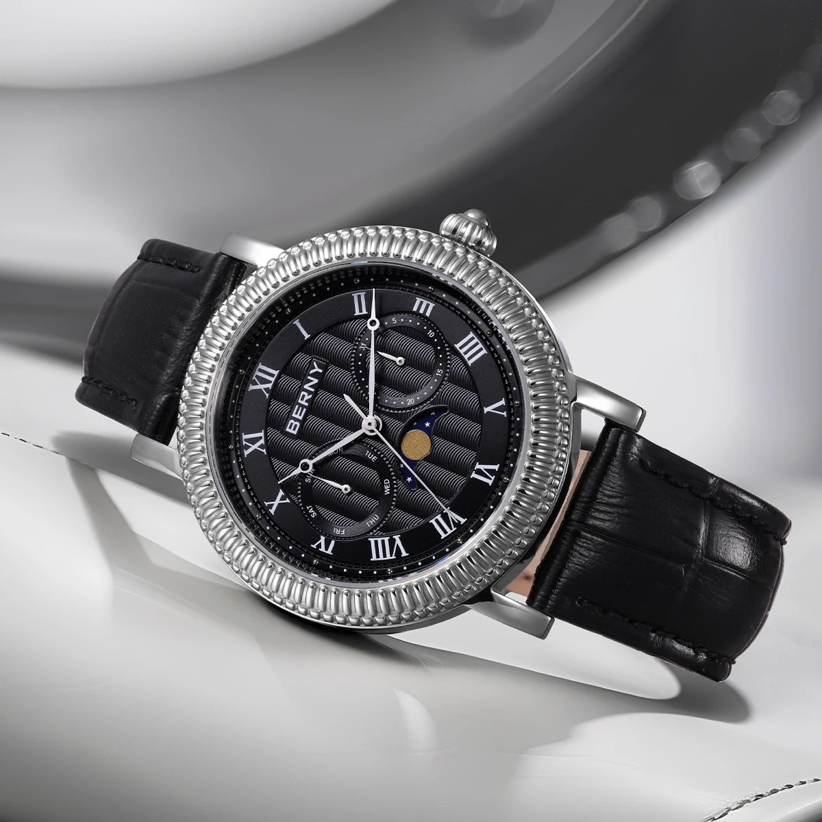 Sculpted Roman numerals, a textured dial, and precision subdials frame the signature moon phase—shielded by scratch-resistant sapphire crystal. The fluted bezel and polished stainless steel case strike a commanding silhouette, anchored by a genuine leather strap. Powered by high-precision quartz for unwavering accuracy.
