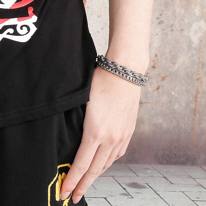 Two chains, one statement. Finished in brushed steel with a clean snap closure, it’s a wrist essential made for sharp minimalists and bold dressers alike.