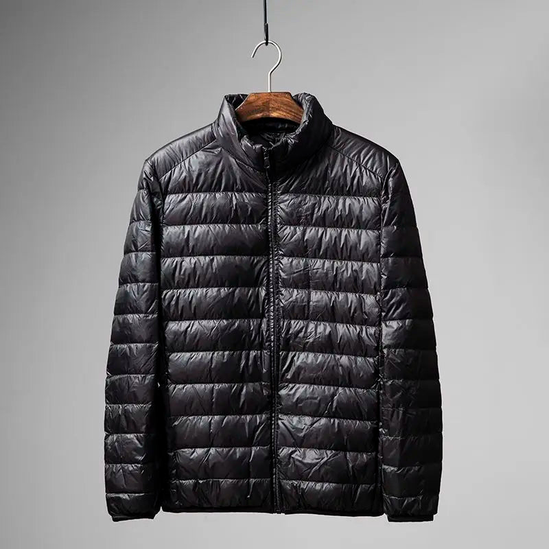 Precision-crafted with horizontal-quilted insulation and a sleek nylon shell, this ultra-lightweight jacket delivers warmth without the bulk. A wind-resistant exterior, hidden zip pockets, heat-trapping collar, and elastic cuffs create a refined, functional silhouette. Perfect for layering or standalone wear, it elevates your cold-weather wardrobe from city streets to mountain air.