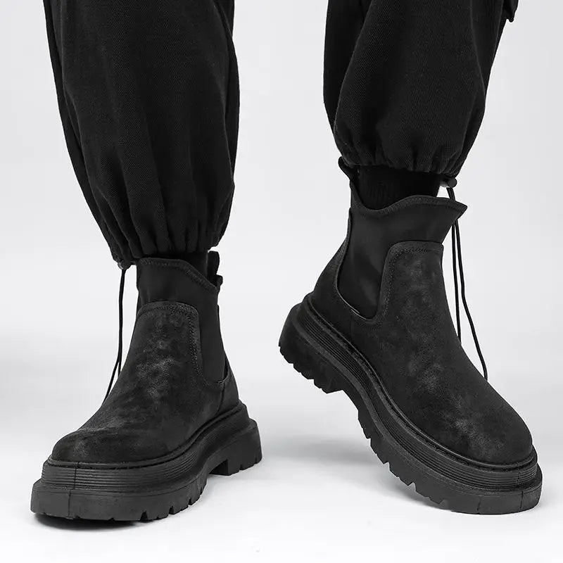 Crafted from matte distressed suede, these Chelsea boots feature a sculpted silhouette set atop a bold, oversized lug sole. Elastic side panels provide a secure, slip-on fit, while reinforced pull tabs add a utilitarian finish. Finished with a thick, elevated sole that adds height and presence without compromising comfort, these boots are built to move hard, feel soft, and wear tough.