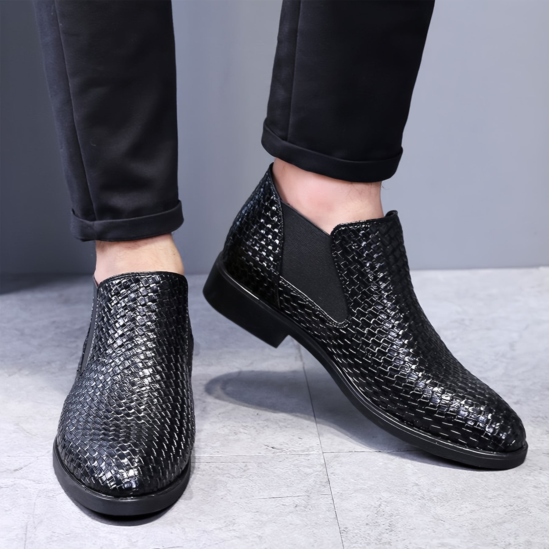 Made from high-gloss faux leather with a woven texture, these Chelsea boots deliver bold structure with refined edge. The streamlined silhouette, almond toe, and low-profile heel create a modern, tailored profile, while elastic side panels ensure effortless wear and lasting comfort—designed for the man who moves from boardroom to after-hours without missing a step.