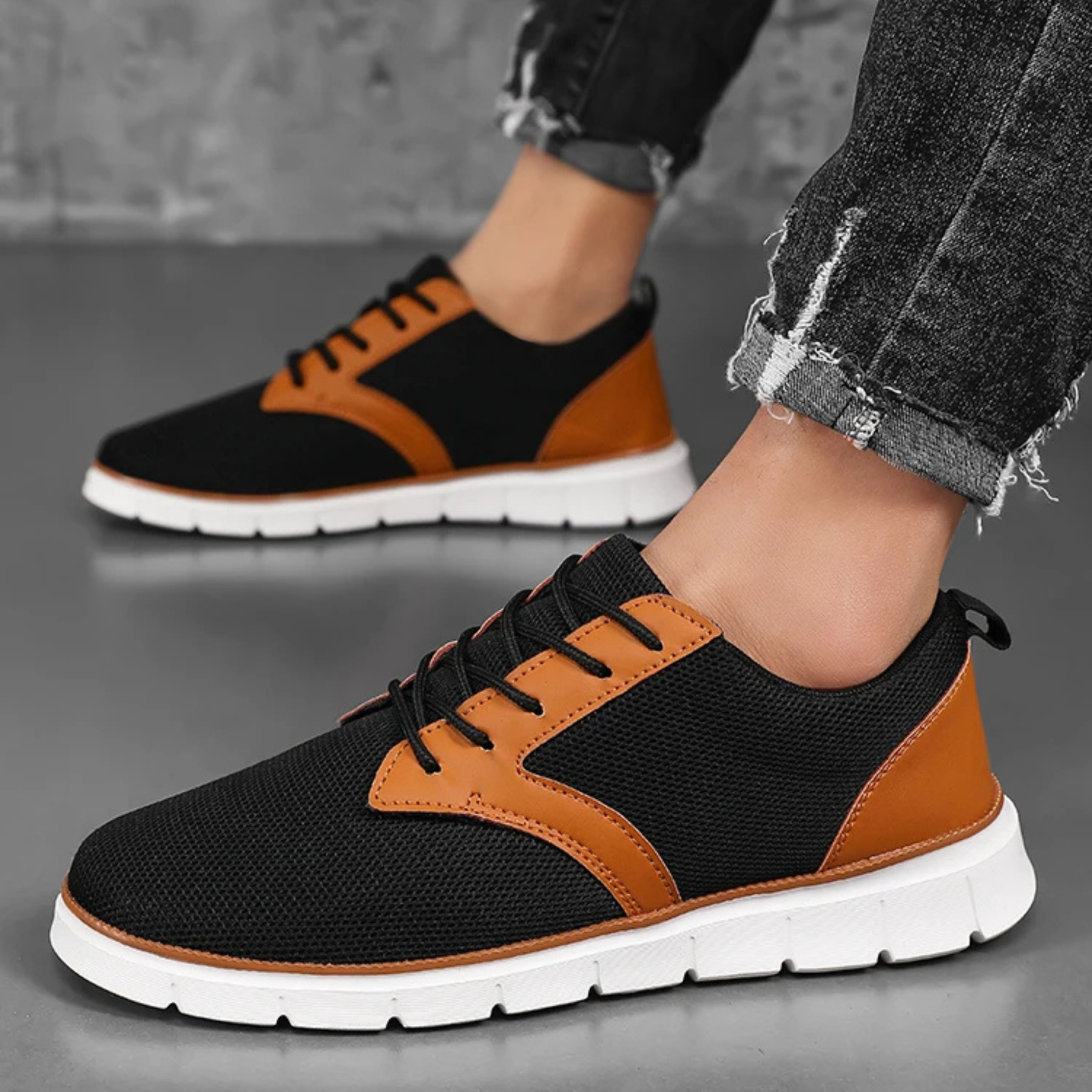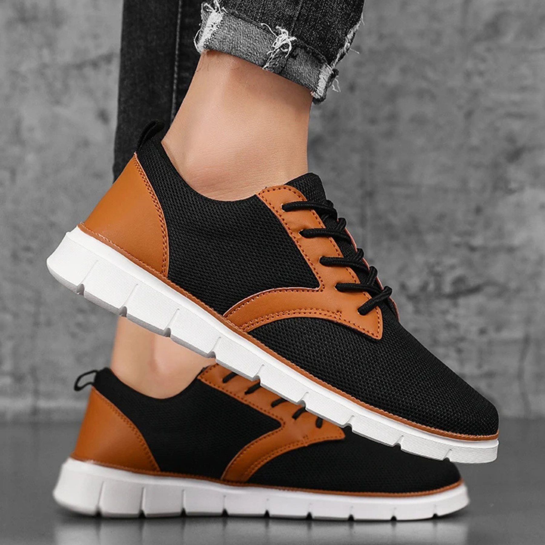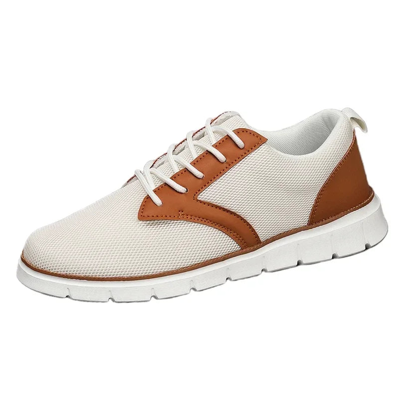 Designed with a breathable woven mesh upper for lightweight airflow, these sneakers feature premium faux leather overlays, contrast stitching, and a dynamic paneled design. A cushioned EVA midsole provides soft, impact-absorbing comfort, while the flexible rubber outsole with multi-directional tread delivers reliable grip on the move.