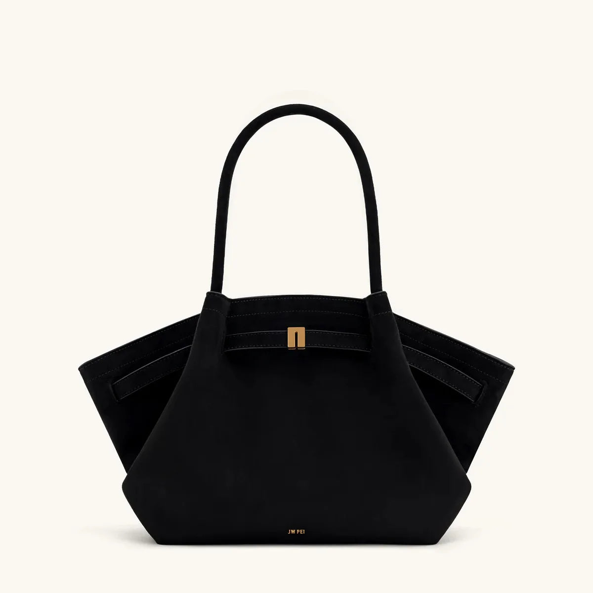 Crafted in ultra-soft vegan suede, this bag combines sculptural curves with origami-inspired folds for a bold, minimalist silhouette. Double rolled handles offer easy carry, while a magnetic clasp secures a spacious, multi-compartment interior. Finished in matte texture with gold-tone hardware, it transitions effortlessly from sharp tailoring to off-duty essentials.