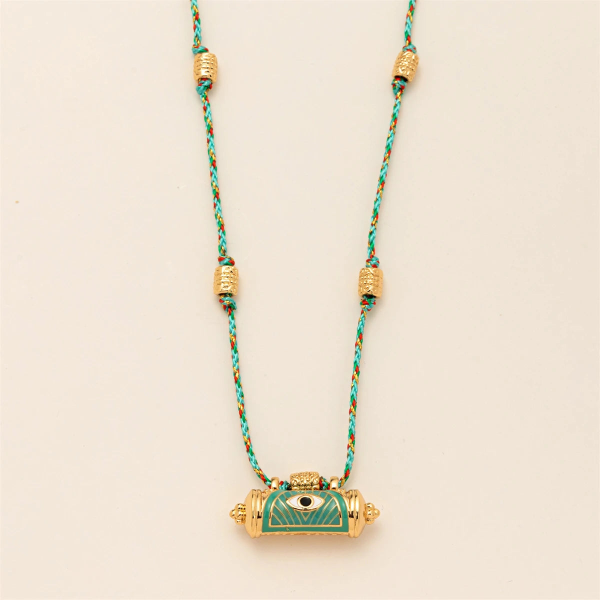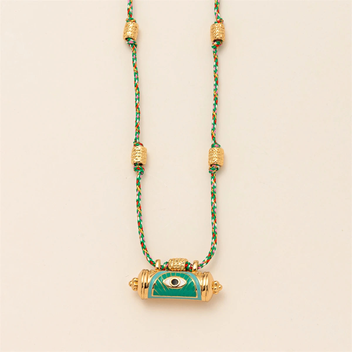 This cylindrical charm necklace features an engraved all-seeing eye, set in vivid enamel and finished in deep jewel tones. Suspended from a braided multicolor rope chain with sculpted gold-tone beads, it’s lightweight, adjustable, and designed to layer or stand alone—part statement, part modern talisman.