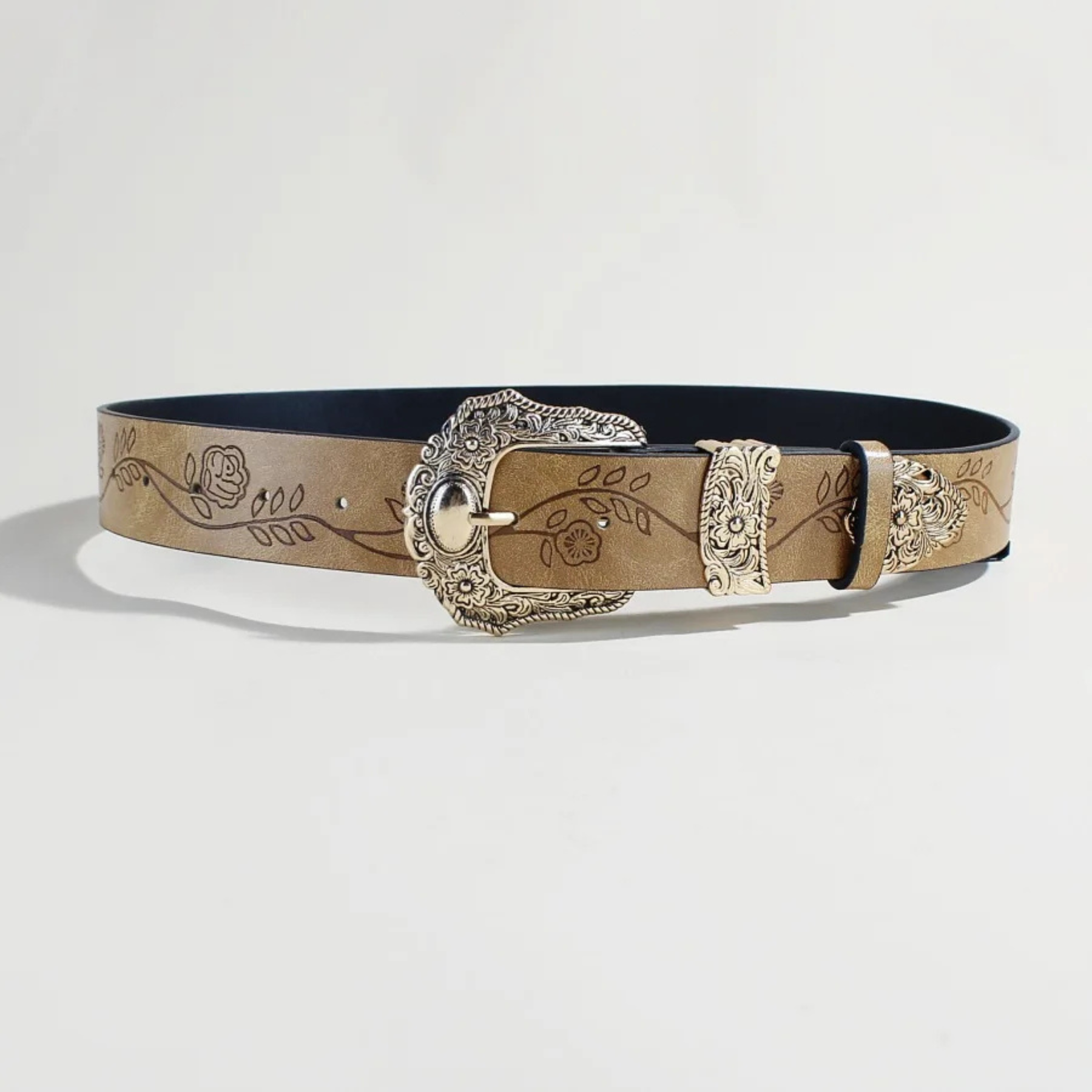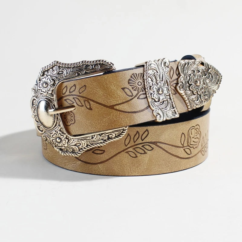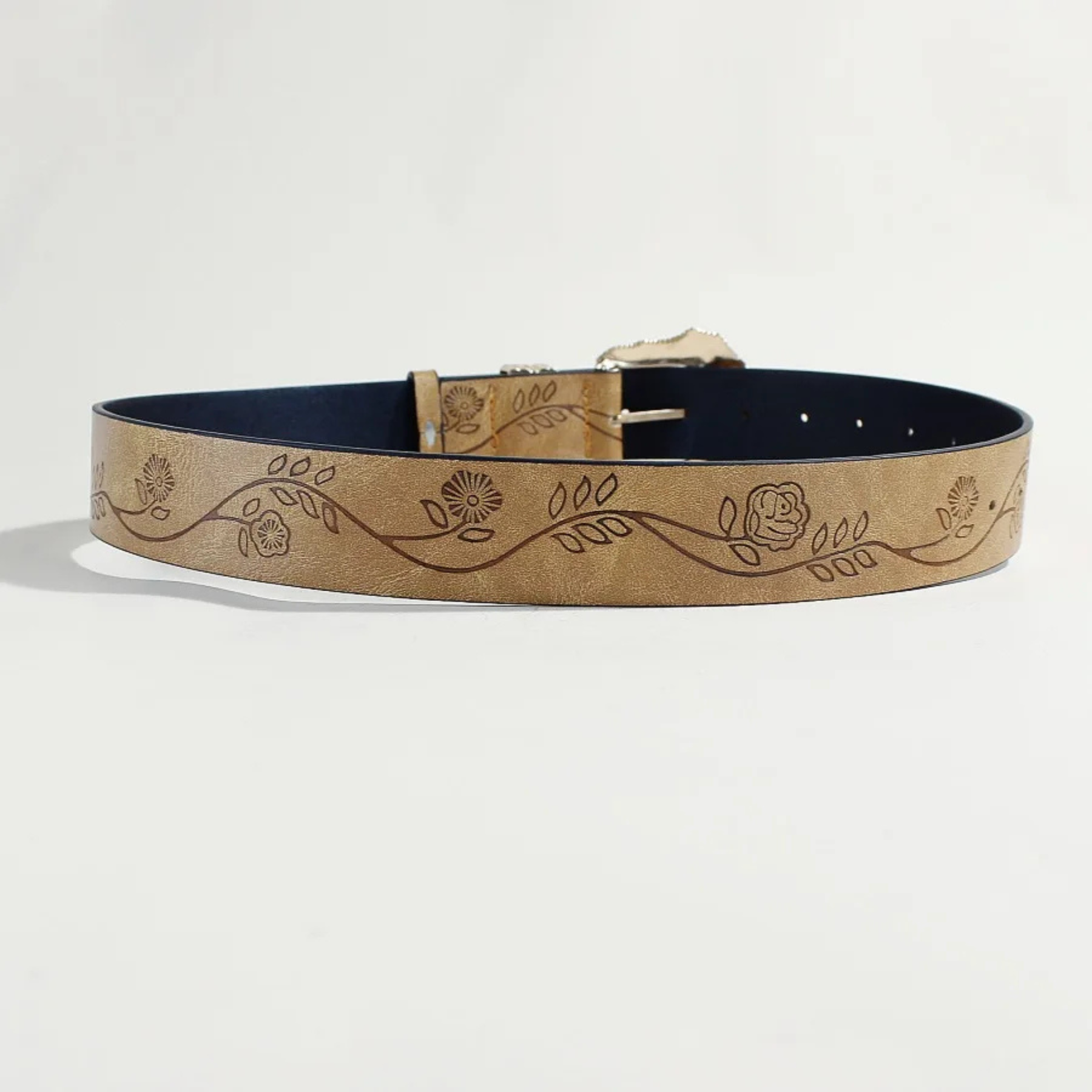 Crafted from smooth, floral-embossed faux leather, this Western-inspired belt features intricately engraved silver-tone hardware—buckle, tip, and keeper. Structured to define the waist without overwhelming the silhouette, it layers effortlessly over denim, dresses, or oversized tailoring for a polished, directional look.