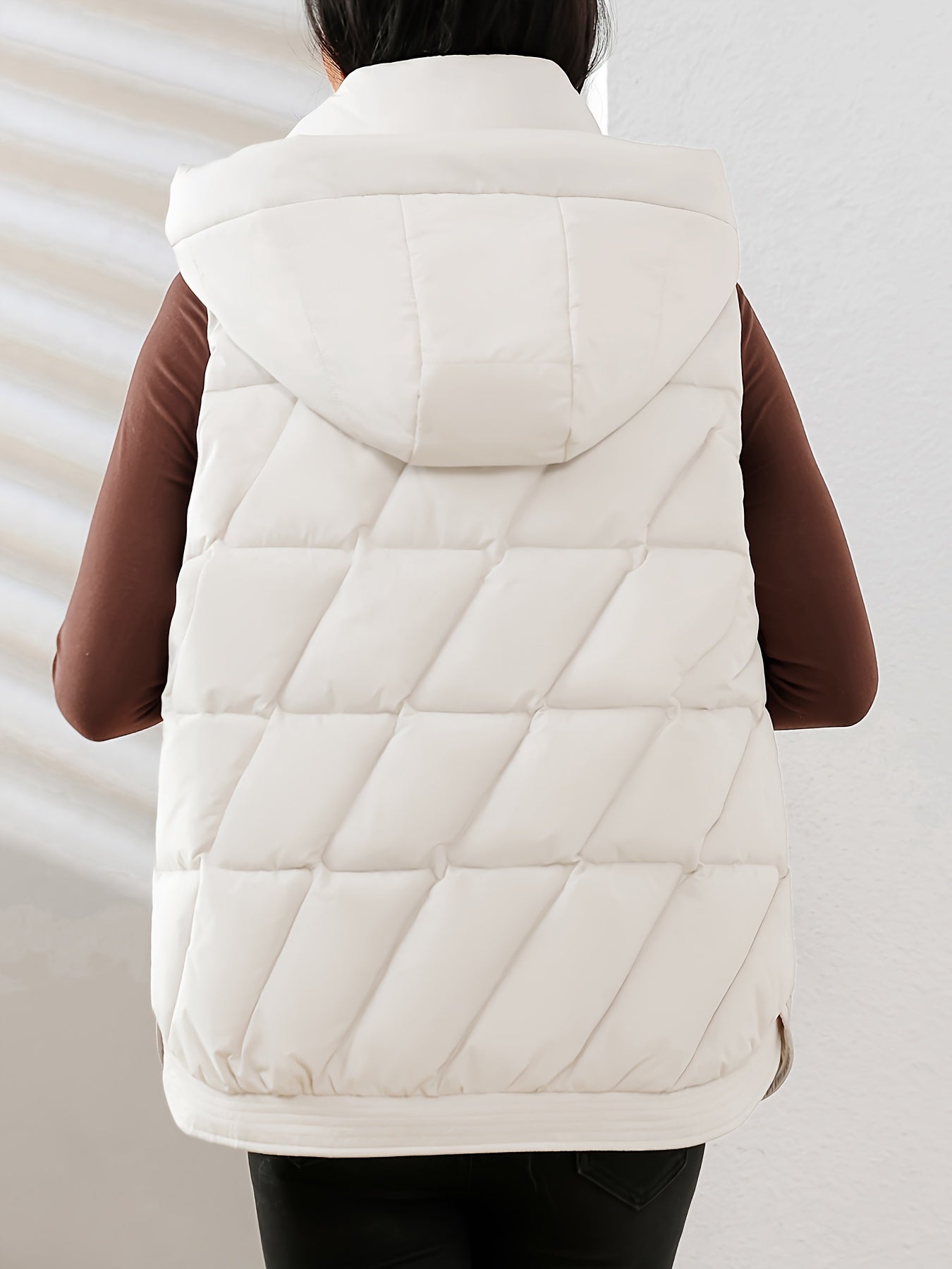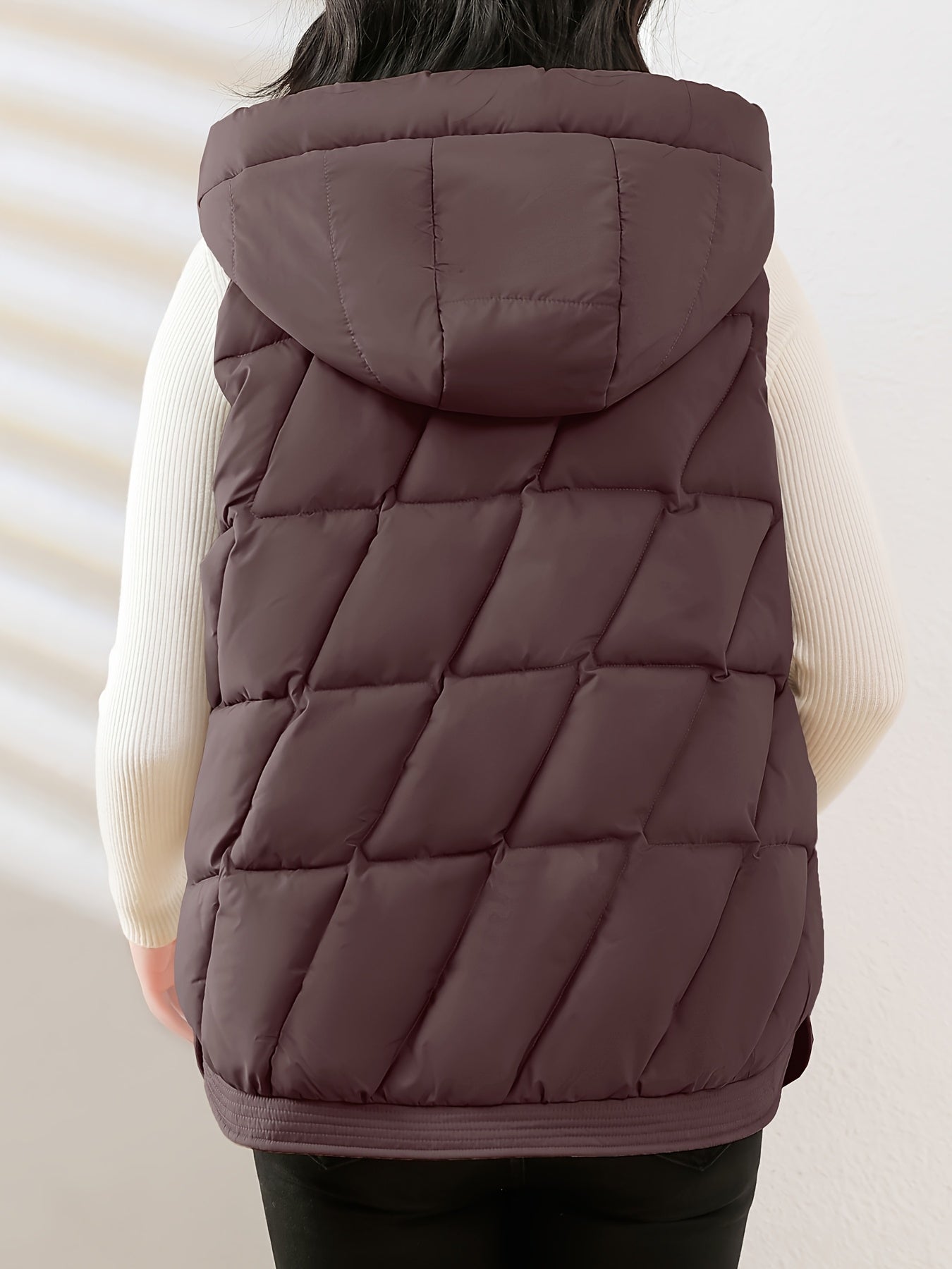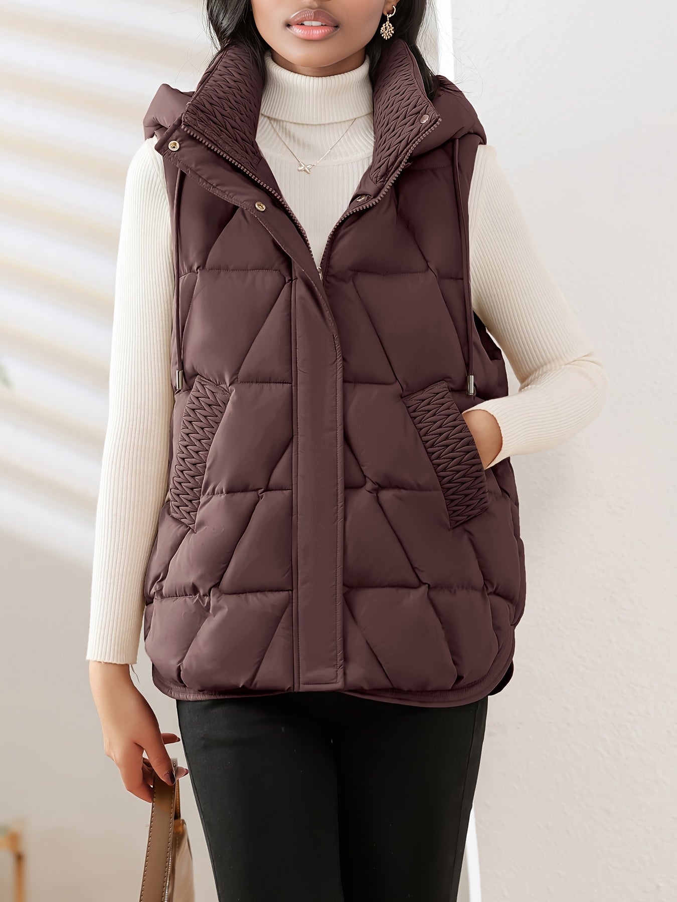 Featuring a matte, soft-touch shell, this quilted puffer vest is defined by sharp diamond stitching and a clean, sculpted silhouette. A high funnel neck and detachable hood lock in warmth without bulk, while woven-texture pocket panels add a luxe, tactile contrast. Finished with a sleek zip front and hidden snaps to complete the minimalist design.