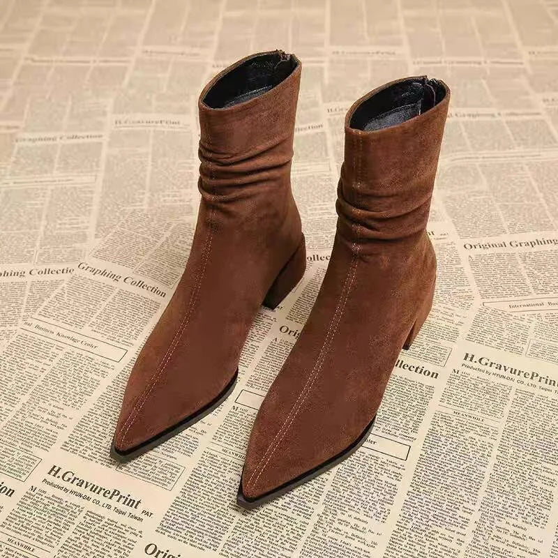 Sleek, sculpted, & unmistakably modern. These pointed-toe ankle boots are cut from premium suede with an elongated silhouette and subtle ruching for texture. A mid-height block heel delivers all-day comfort, while the clean back-zip closure keeps the profile razor-sharp. Tailored trousers or flowing skirts—these boots elevate it all.