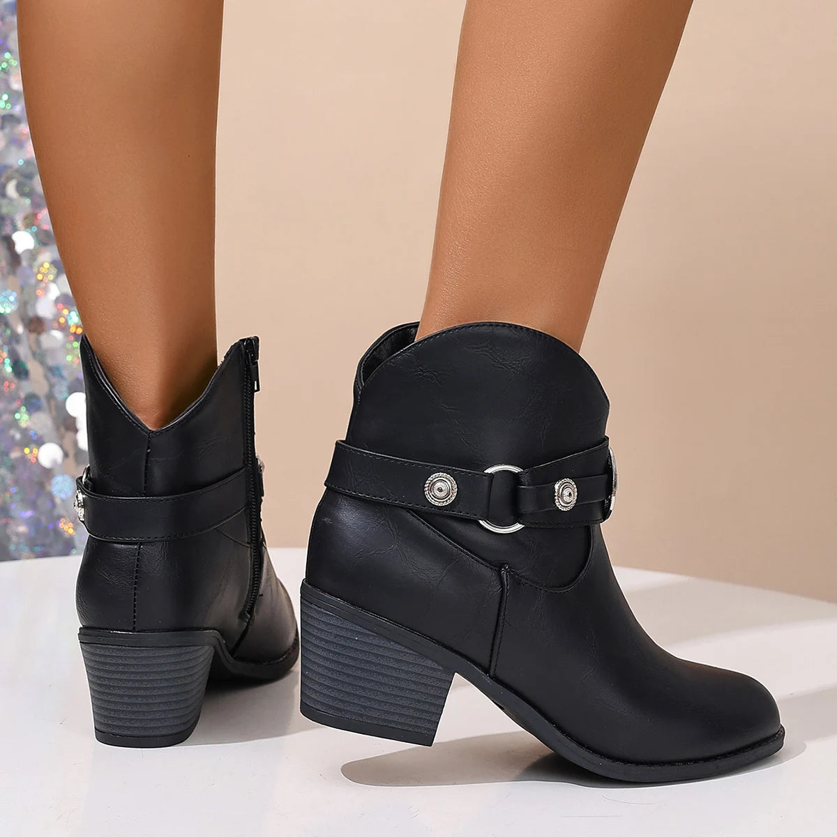 A sculpted heel meets Western edge — these ankle boots combine smooth, structured faux leather with a vintage buckle and curved collar that frames the ankle. Antique hardware adds contrast, while the almond toe and stacked block heel create clean, elongated lines.